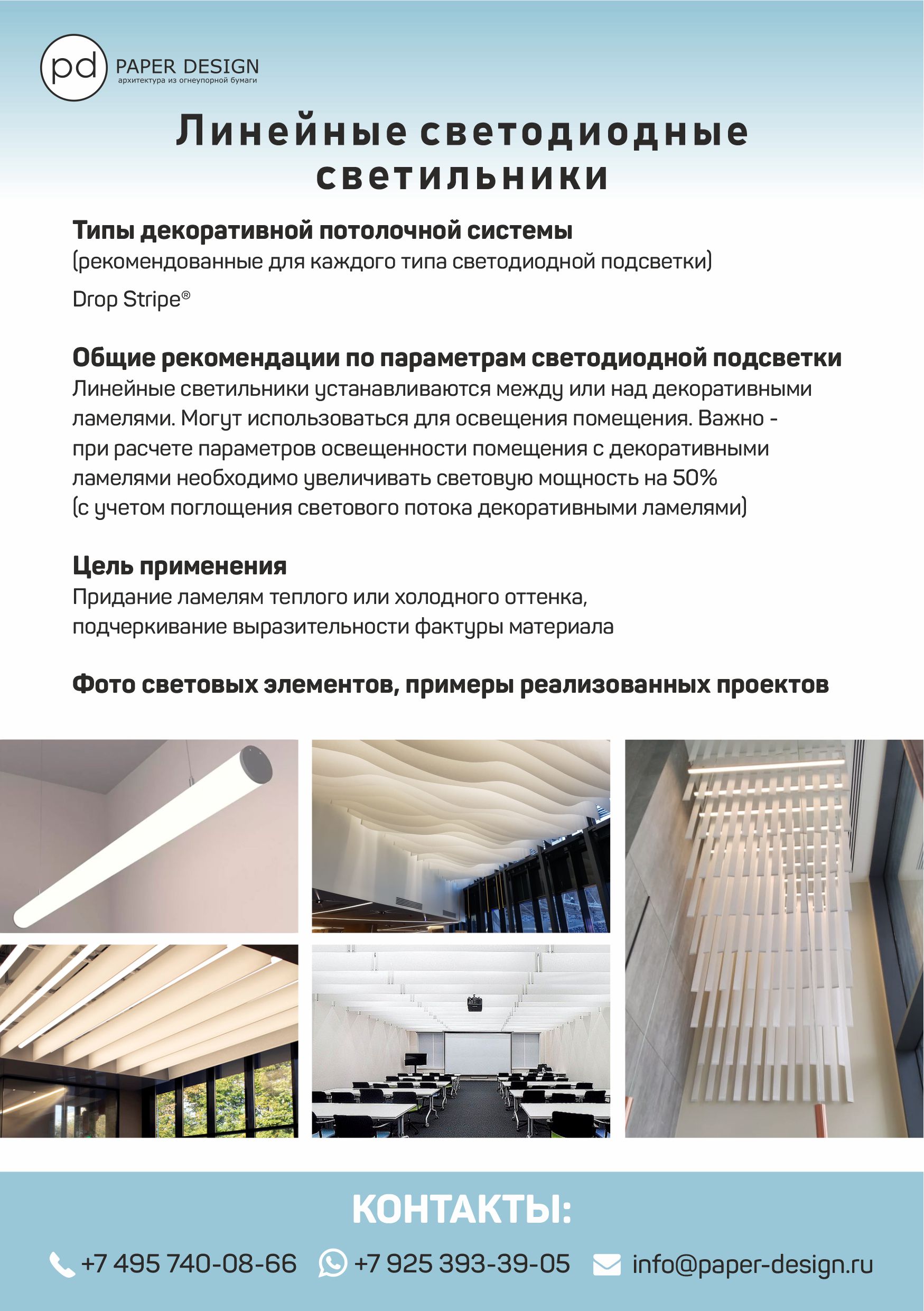 Благодаря конструкции систем Paper Design®, можно встраивать направленные светильники между ламелями, сохраняя визуальную лёгкость потолка и обеспечивая при этом достаточное освещение рабочих поверхностей.