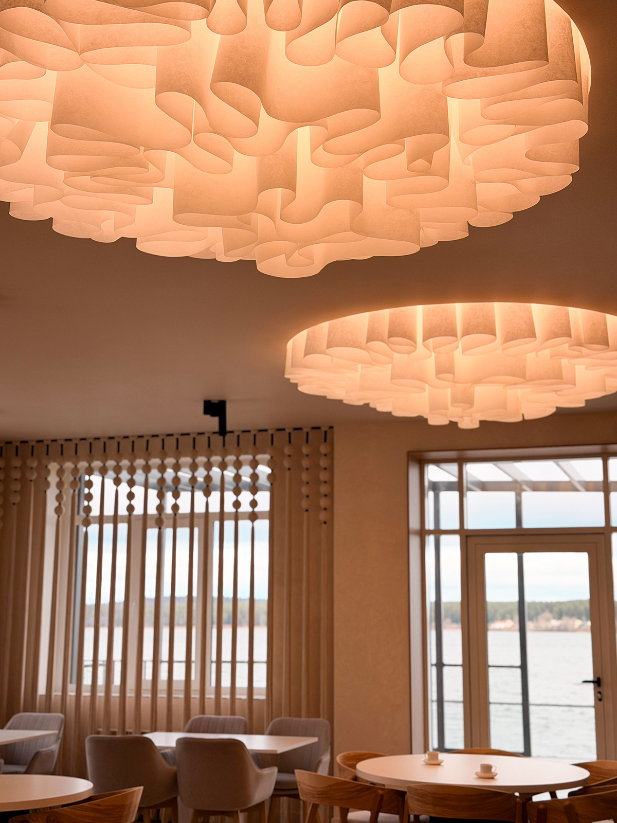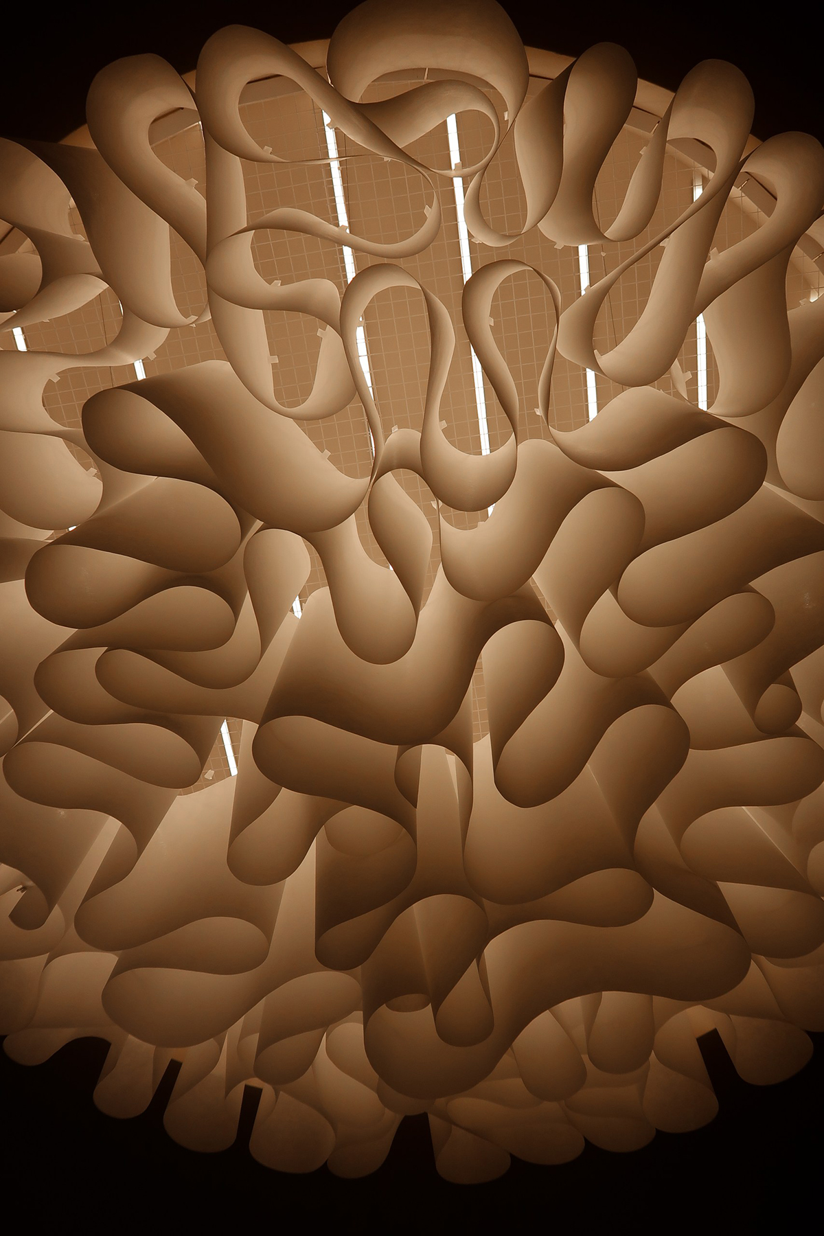 Благодаря светорассеивающим свойствам нетканого материала Drop Paper®️, потолочная композиция выполняет не только эстетическую, но и функциональную роль, становясь бумажной люстрой.