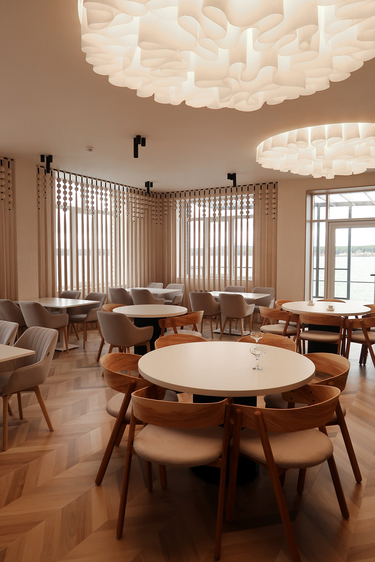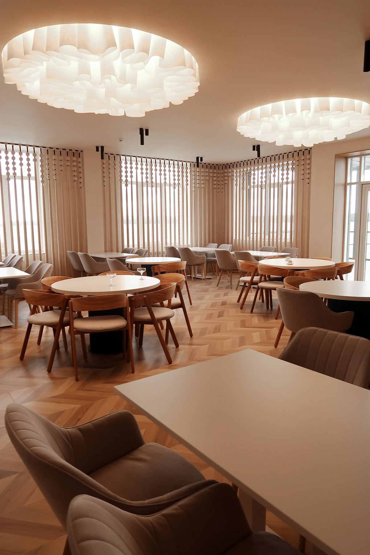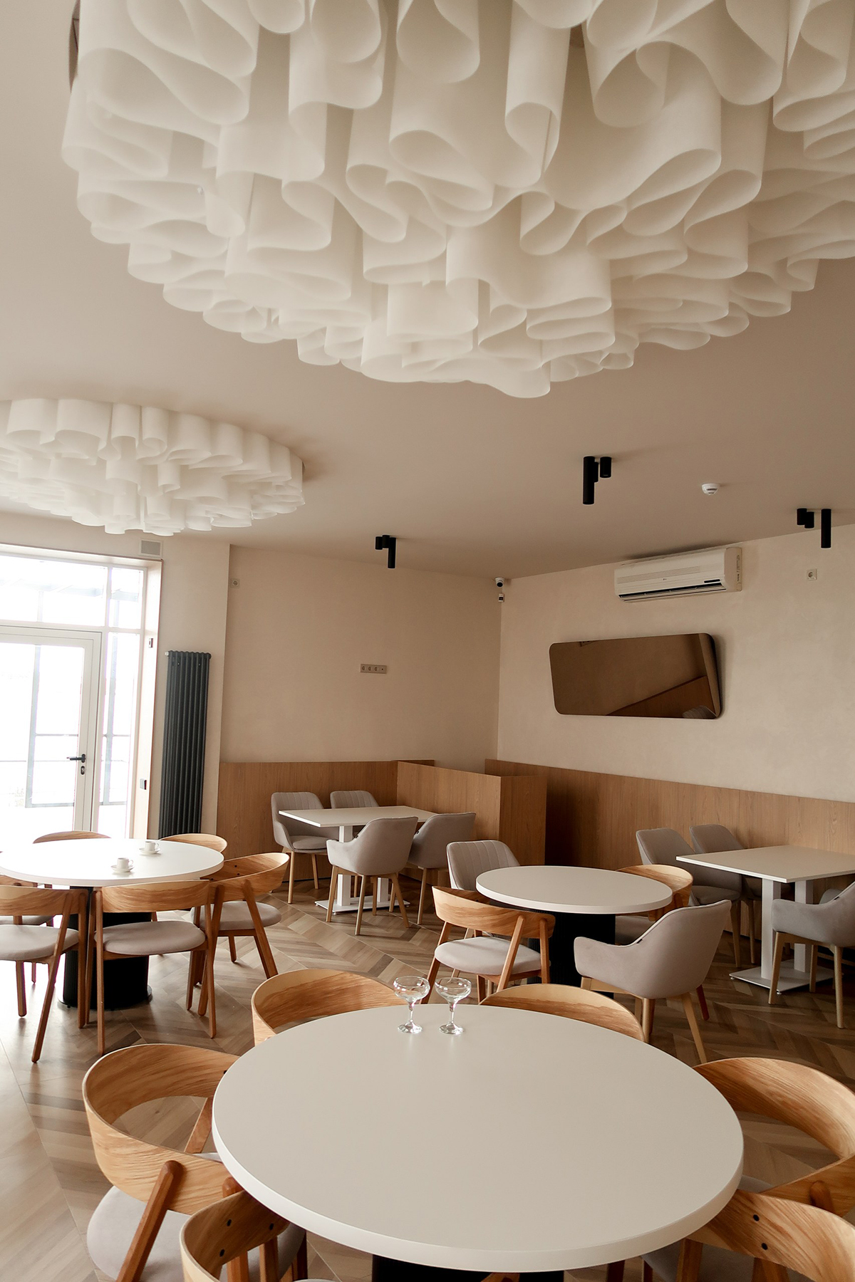 Мягкие формы и светлые оттенки присутствуют в каждой детали пространства. Две круглые ниши диаметром 2 м, визуально связанные с геометрией столиков, заполнены лёгкими декоративными композициями. Ламели с градиентом высот 300–400–500 мм подсвечены изнутри тёплым светом — деликатный штрих, создающий ощущение уюта.