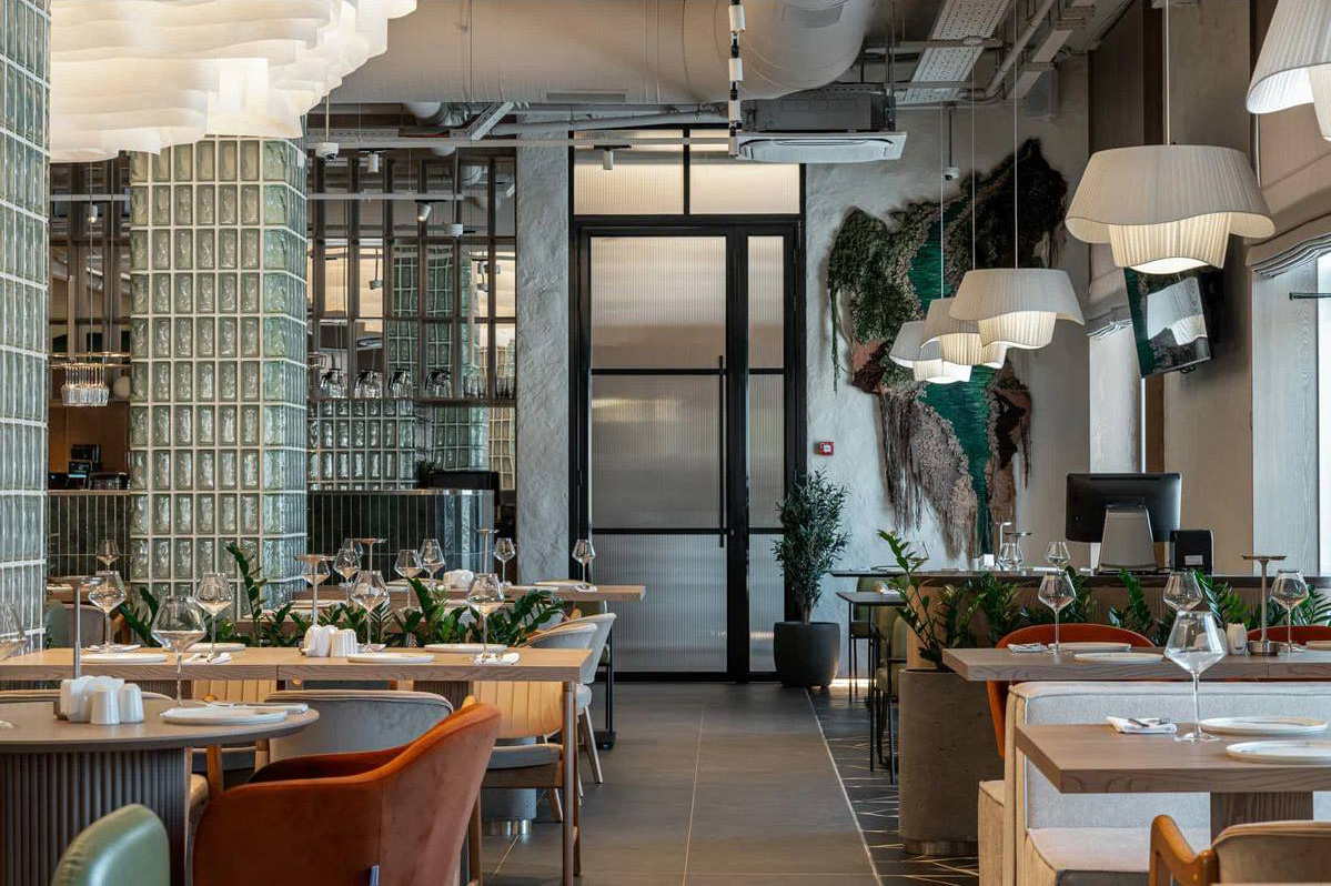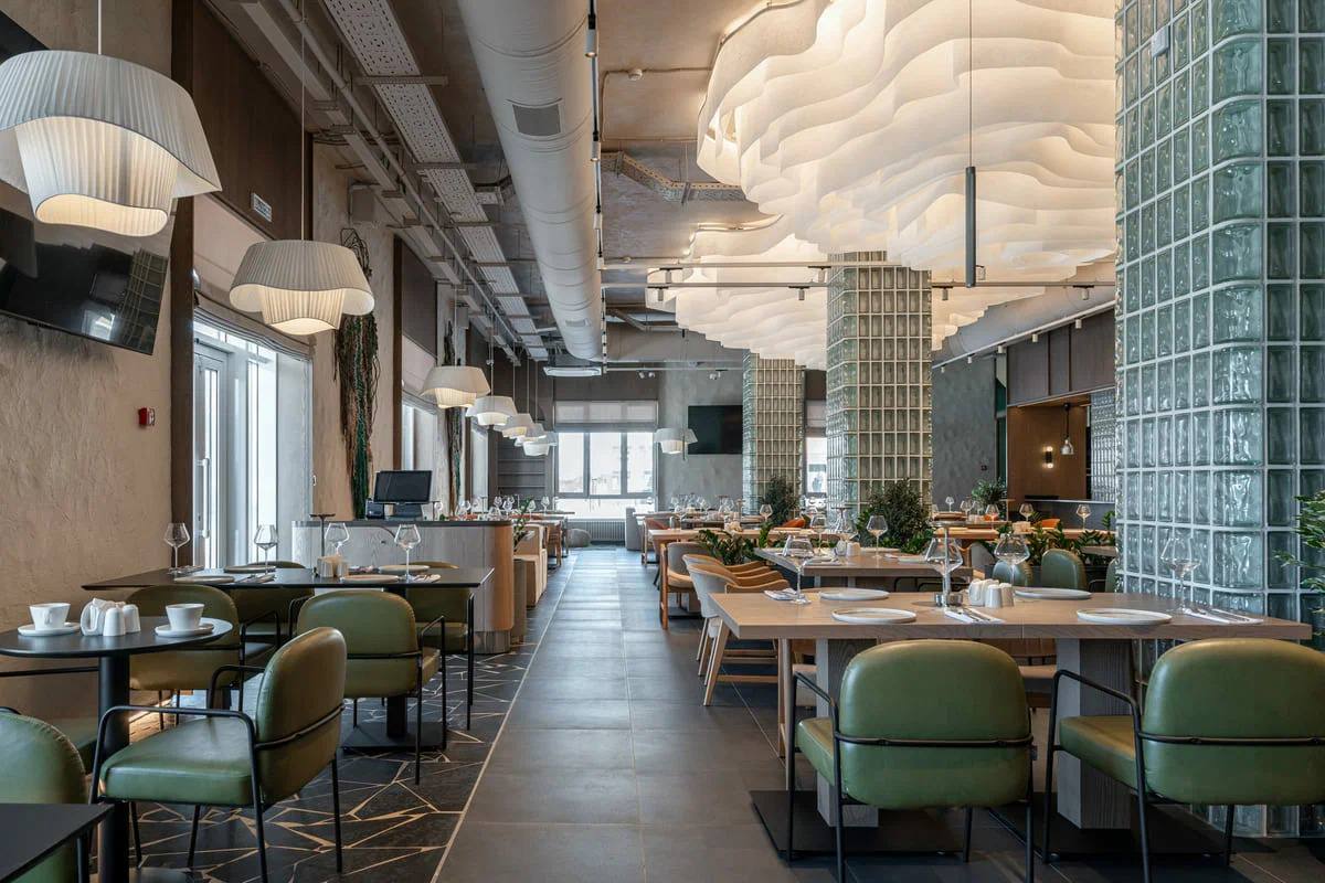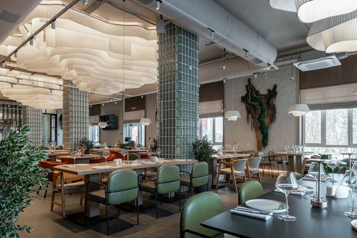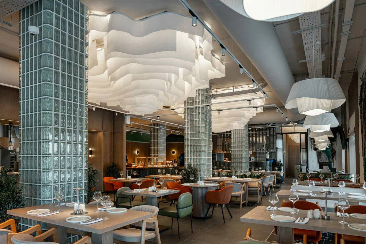 Три декоративные зоны ресторана оформлены ламелями переменной высоты — 300–1300 мм, 275–1300 мм и 525–1275 мм, выстроенными по плавной геометрии алюминиевого профиля. Живой волнообразный рисунок становится отражением живописной, нерукотворной асимметрии природы.
