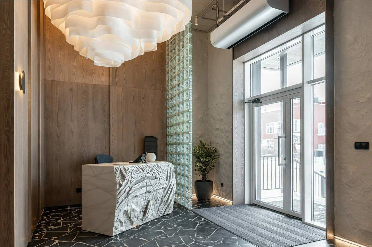 Концепция интерьера вдохновлена айдентикой острова и его суровым климатом, отражая мощные природные образы. Парящие, невесомые потолки Wave Ceiling®️, подсвеченные диодной лентой, усиливают ощущение величественной северной красоты.