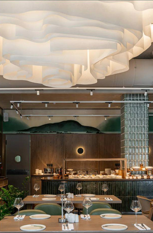 Сегодня делимся фотографиями проекта в Южно-Сахалинске, созданного Pergaev Bureau. Ресторан «Бора» при отеле Azimut украсил наш облачный потолок из нетканого материала Drop Paper®️.